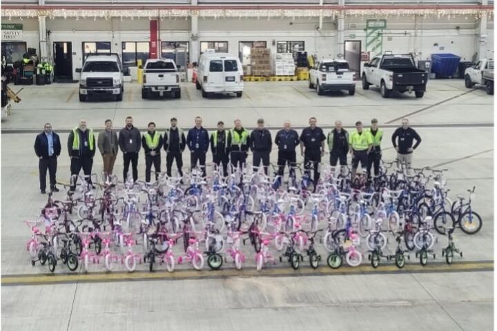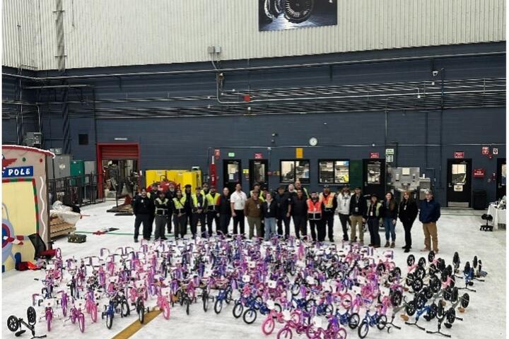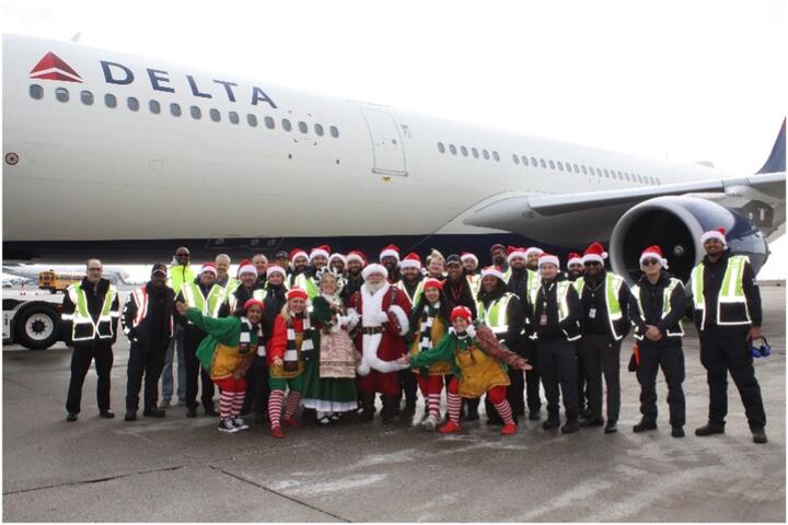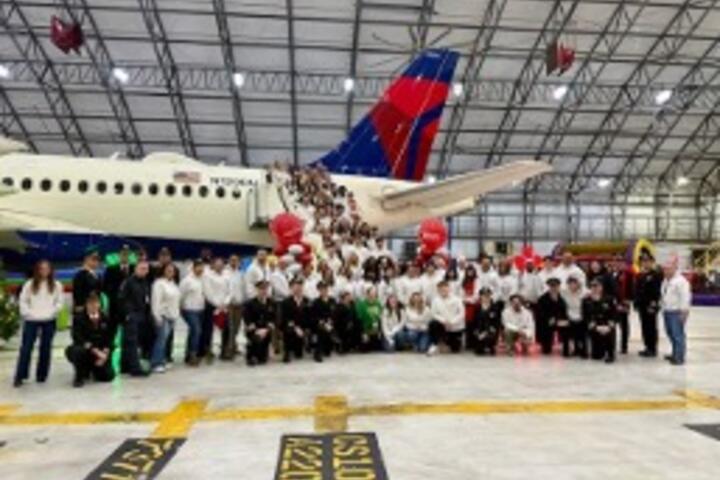Delta Spirit A350 aircraft inside a hangar with TechOps employees on a stage