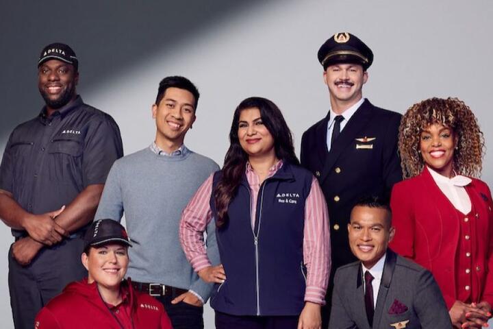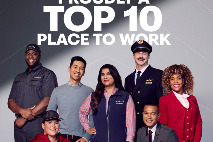 Delta Spirit A350 aircraft inside a hangar with TechOps employees on a stage