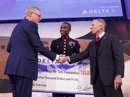 Delta TechOps presented a record 1,700 bikes, over 1,300 new toys and a check for $50,000 from Delta to the Marine Toys for Tots Foundation Atlanta affiliate at a festive, fun-filled event at the TechOps Hangar in Atlanta on December 4th.