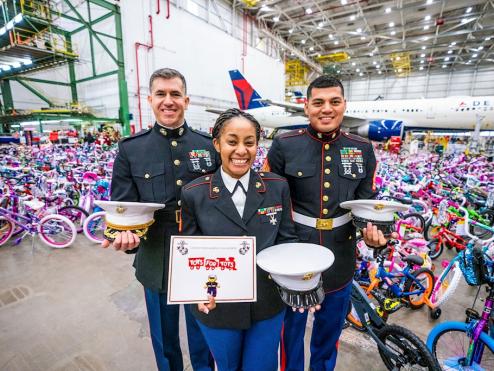 On Dec. 10, Delta TechOps celebrated the holidays in a big way by presenting a record 2,123 bikes, over 3,000 new toys and a check for $50,000 from Delta to the Marine Toys for Tots Foundation Atlanta affiliate at a festive event at the TechOps Hangar in Atlanta. It was a record-breaking year with Delta exceeding both its bike and toy donation goals.