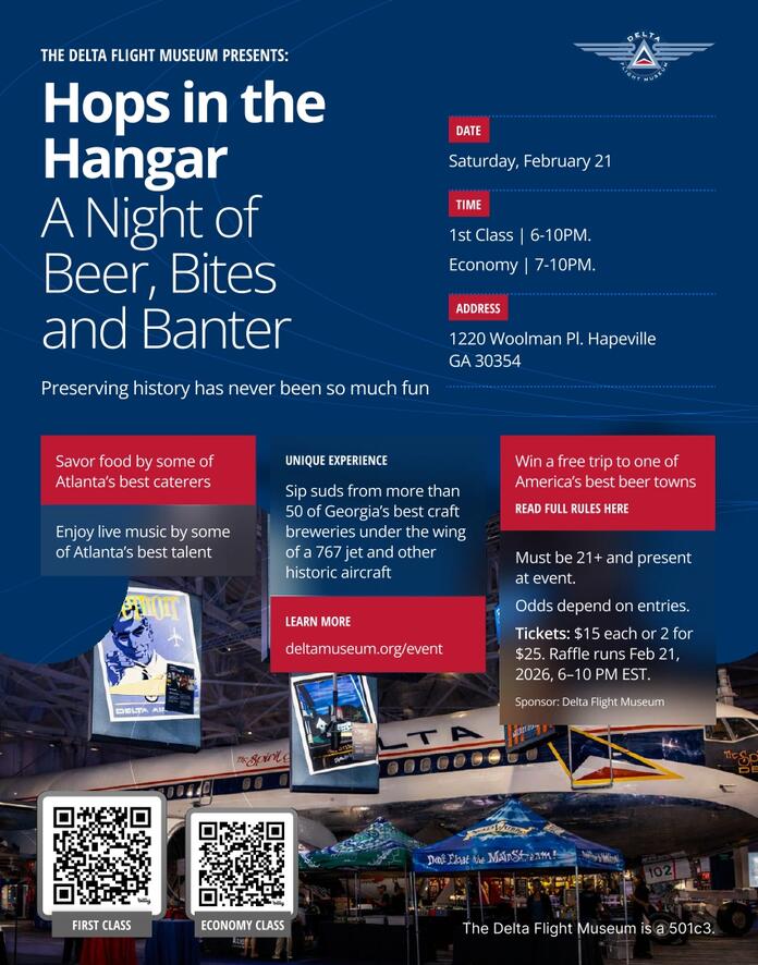 Hops in the Hangar – A Night of Beer, Bites and Banter, Delta Flight Museum’s annual fundraising event that celebrates the best craft brews and aviation history, will be held on Saturday, Feb. 21, and tickets are now on sale on the Delta Flight Museum events page.