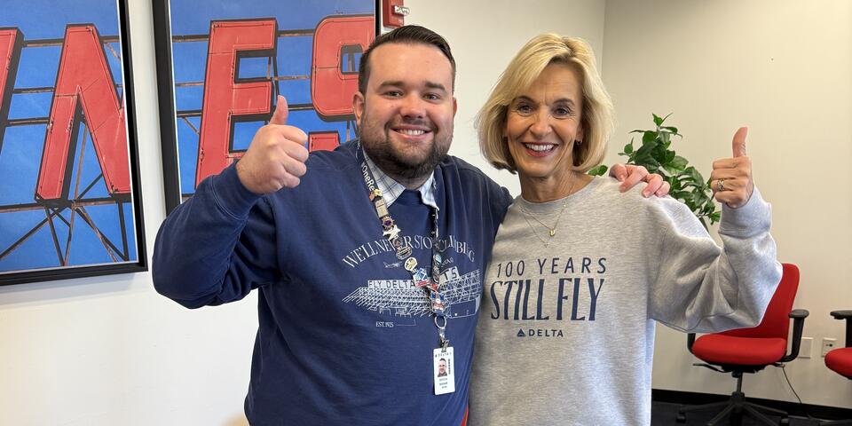 I hear from people who have been with us for over 50 years, and some who are still just starting out. Take Bryce Boigner, who like me graduated with a journalism degree and had dreams of being a newspaper reporter. But the economy had other ideas when he graduated during the COVID-19 pandemic in 2020. So he decided to start his career with Delta as a Reservations & Care agent.