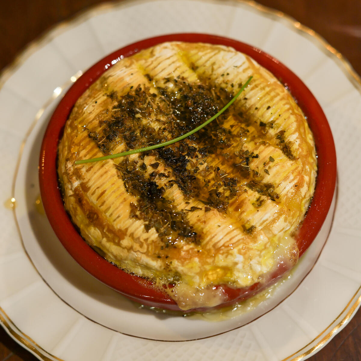 A wheel of Camembert cheese scored, seasoned and baked until gooey inside. This dish is a French classic, served with warm bread.